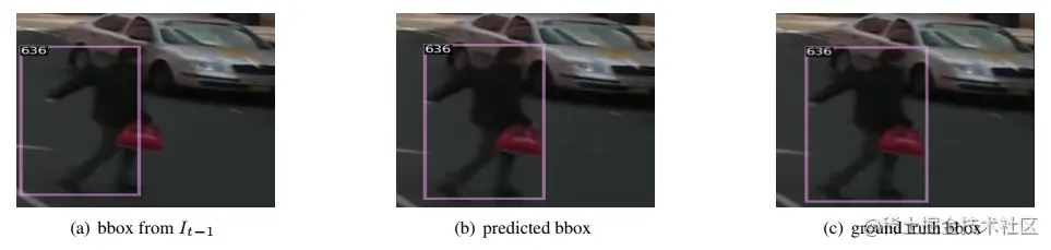 我们知道,此前的 MOT 方法对运动的建模主要采用卡尔曼滤波为代表的状态估计方法、光流法和位移预测法,这篇论文使用稀疏光流法预测 bbox 的中心点运动,由于目标的运动有时候是高速的,为了应对这种运动模式,必须采用合适的光流方法,文章采用金字塔光流,该方法鲁棒性很强,具体想了解的可以参考这篇博客,下图是金字塔光流预测的目标当前帧位置(b 图),c 图是 GT 的框,可以看到,预测还是很准的。