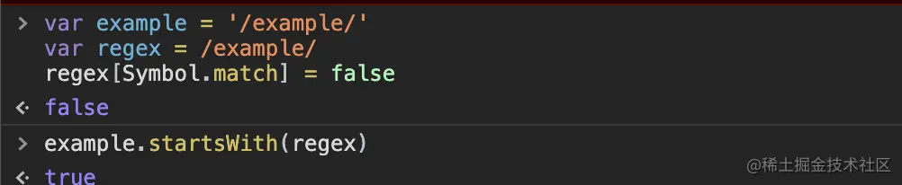 如果将一个正则表达式的Symbol.match属性设为false,当传入.startsWith、.endsWith或者.includes时,该正则表达式会被当作字符串字面量。