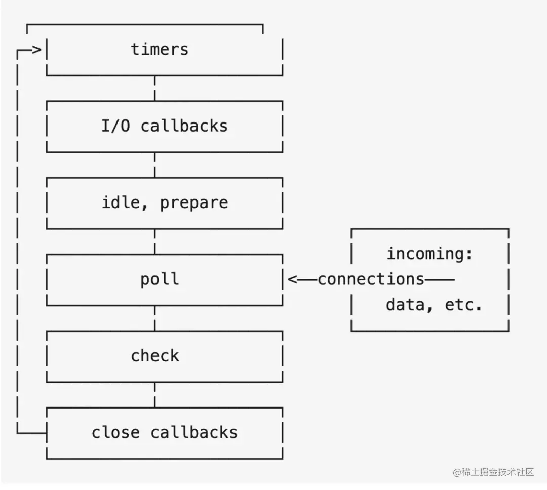 外部输入数据-->轮询阶段(poll)-->检查阶段(check)-->关闭事件回调阶段(close callback)-->定时器检测阶段(timer)-->I/O事件回调阶段(I/O callbacks)-->闲置阶段(idle, prepare)-->轮询阶段...