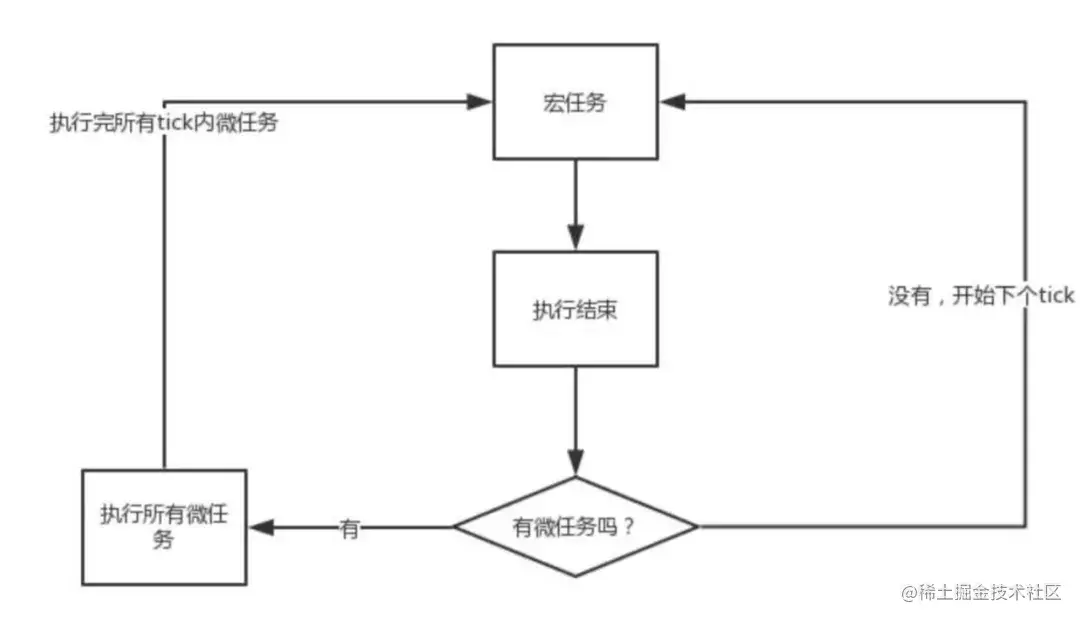 在一个事件循环中,异步事件返回结果后会被放到一个任务队列中。然而,根据这个异步事件的类型,这个事件实际上会被对应的宏任务队列或者微任务队列中去。并且在当前执行栈为空的时候,主线程会 查看微任务队列是否有事件存在。如果不存在,那么再去宏任务队列中取出一个事件并把对应的回调加入当前执行栈;如果存在,则会依次执行队列中事件对应的回调,直到微任务队列为空,然后去宏任务队列中取出最前面的一个事件,把对应的回调加入当前执行栈...如此反复,进入循环。