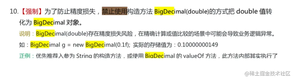 注意:我们在使用BigDecimal时,为了防止精度丢失,推荐使用它的 BigDecimal(String) 构造方法来创建对象。《阿里巴巴Java开发手册》对这部分内容也有提到如下图所示。