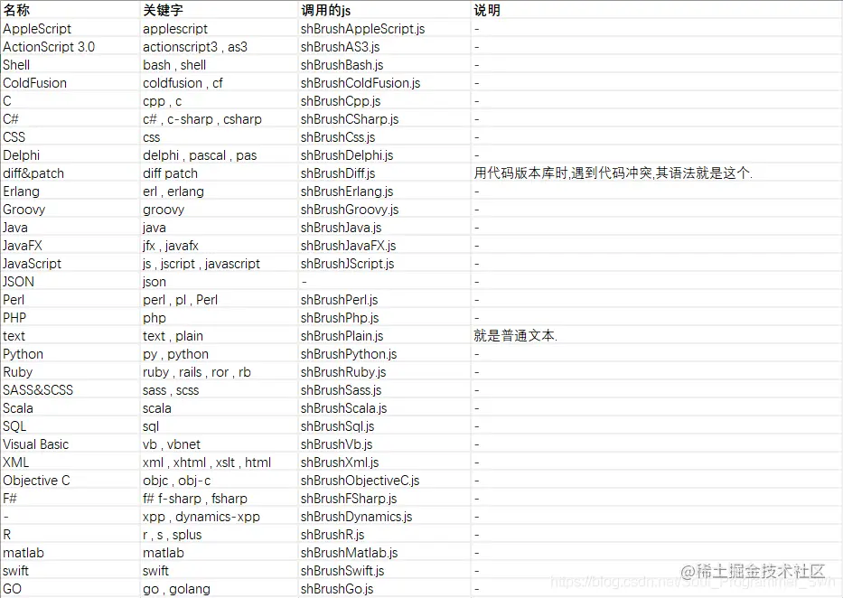 为了代码准确的高亮,建议指定语言类型。MD支持以下语言: