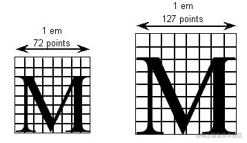 图 9 两个 em 方块的网格:左侧每 em 包含 8 个单位,右侧每 em 包含 16 个单位