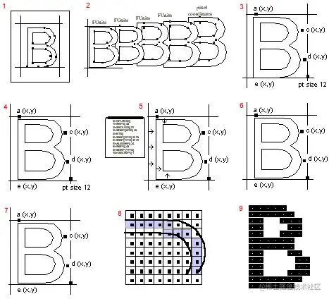 首先,要将字体文件中存储的轮廓缩放到要求的尺寸,即将字体文件中以 FUnit(Font Uint,字体单位)表示的原始轮廓转换为特定于设备的像素坐标。