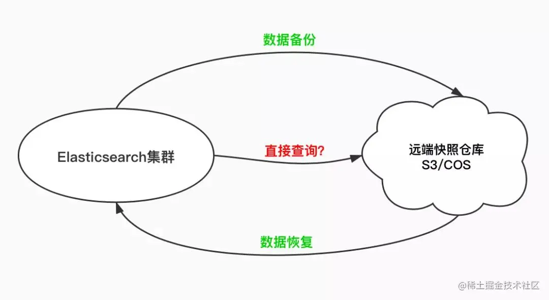 在 Searchable snapshots 可搜索快照功能发布之前,通过调用 _snapshot API 对索引打的快照,不管是存储在 S3 还是 HDFS 或者是腾讯云的对象存储 COS上,都是不能够直接进行查询的。