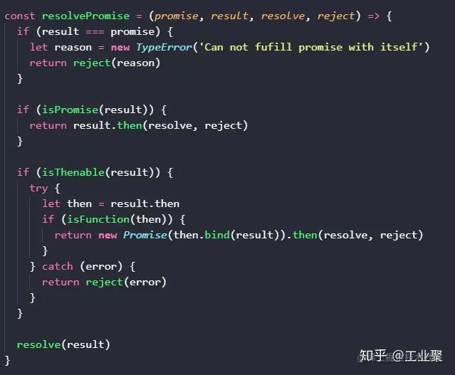 第三个判断 result 是不是 thenable 对象,是就先取出 then,再用 new Promise 去进入 The Promise Resolution Procedure 过程。