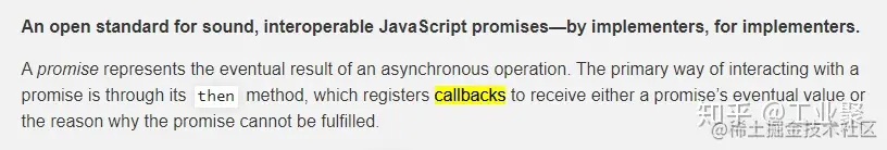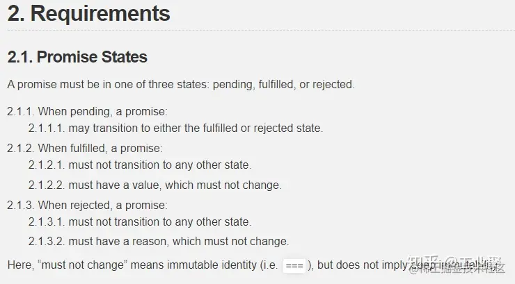实际上,Promises/A+ 规范,内容简短,实现难度低。其中充斥着细节行为的描述,缺乏设计目的和背景的部分,完全没有介绍使用场景。并不是一个入门 Promises 的好材料。