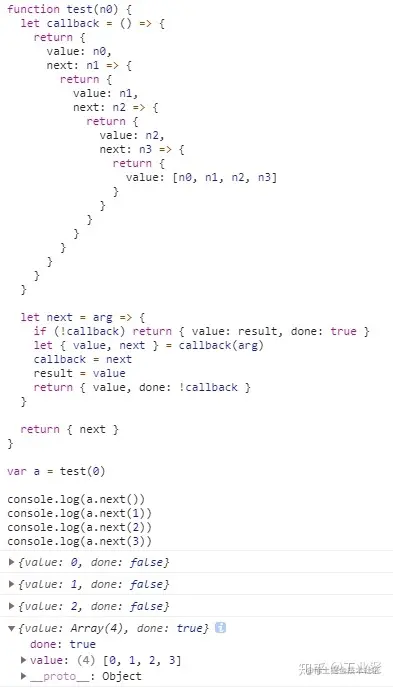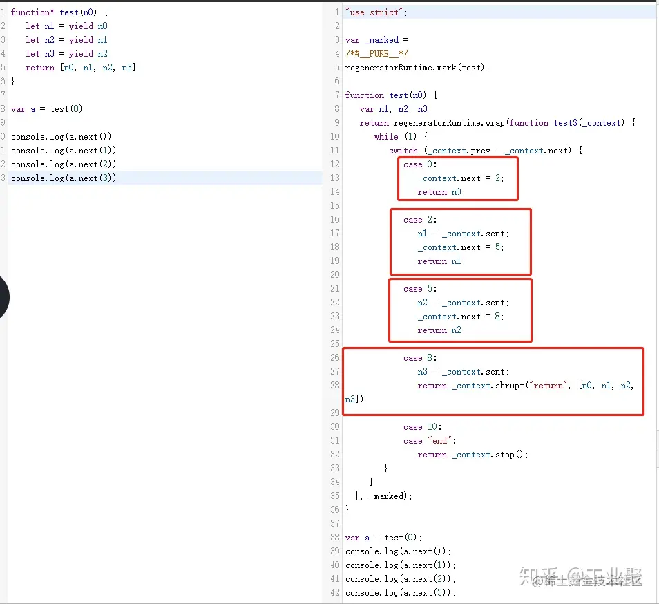 我们的处理是过度简化的。只做了 next 方法,没有提供 throw 和 return 方法,也没有演示如何处理循环语句里的 yield,但基本思路是一致的。