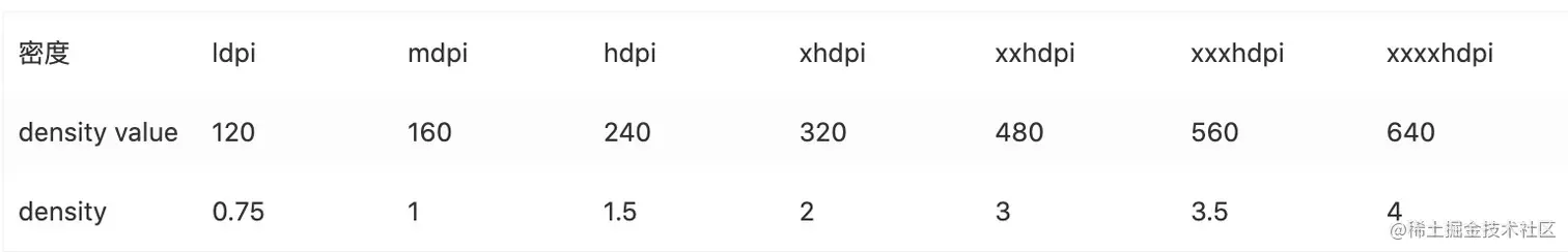 可以看到decodeResourceStream方法中针对option中的inDensity和inTargetDensity做了处理,如果放在资源文件中,inDensity不同的density有不同的值,具体值如下边的表,inTargetDensity取决于具体的Android设备.如果放在磁盘或者assets目录中那么这两个值都未0.