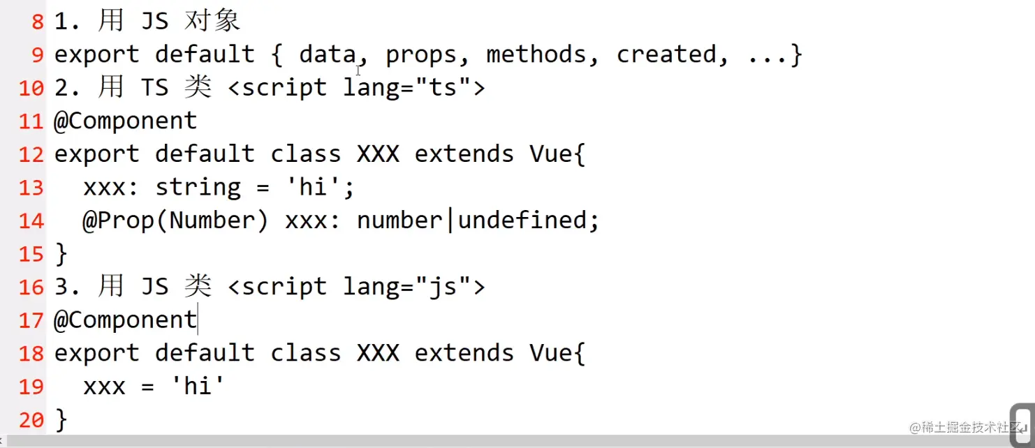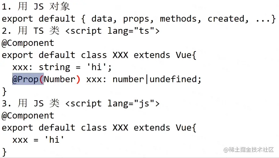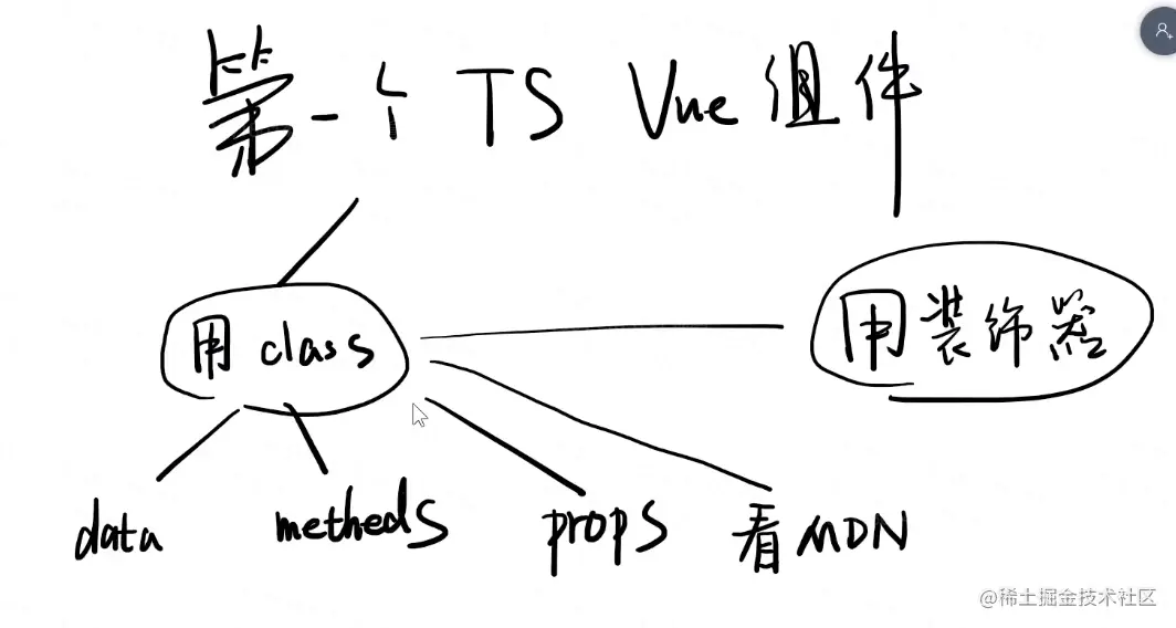 - Vue组件由 class ,装饰器,以及原版js组件中就有的东西,具体用法查看