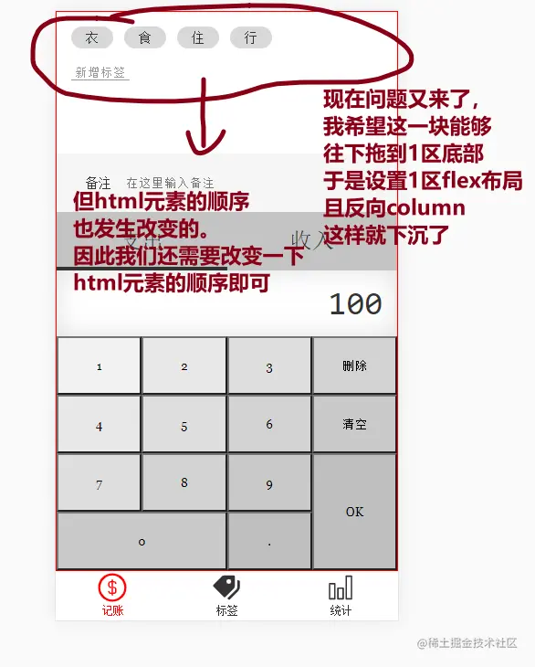 - 但是为了1区中的上半部分能够下沉,于是我再把1区设置为flex布局,把1区flex方向设置为反向column;