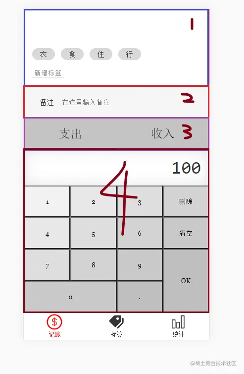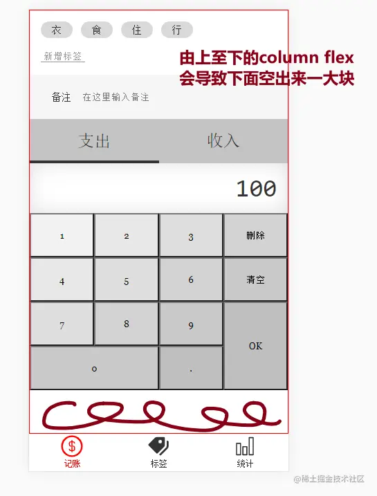 - 那么最终出来的效果就是,即1区拿掉剩余高度,并且1区的标签增多会往上顶
