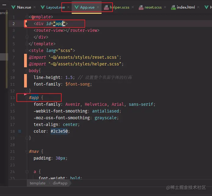 App.vue中的样式中的#app指的是初始化时侯的App.vue的wrapper有个id="app"