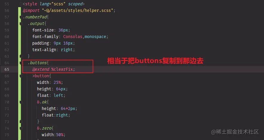- 相当于把.buttons这个类名拷贝一份到helper.scss中去