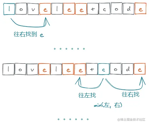 // 定义两个指针 l, r 分别向左、右两个方向寻找目标字符 C,取最短距离