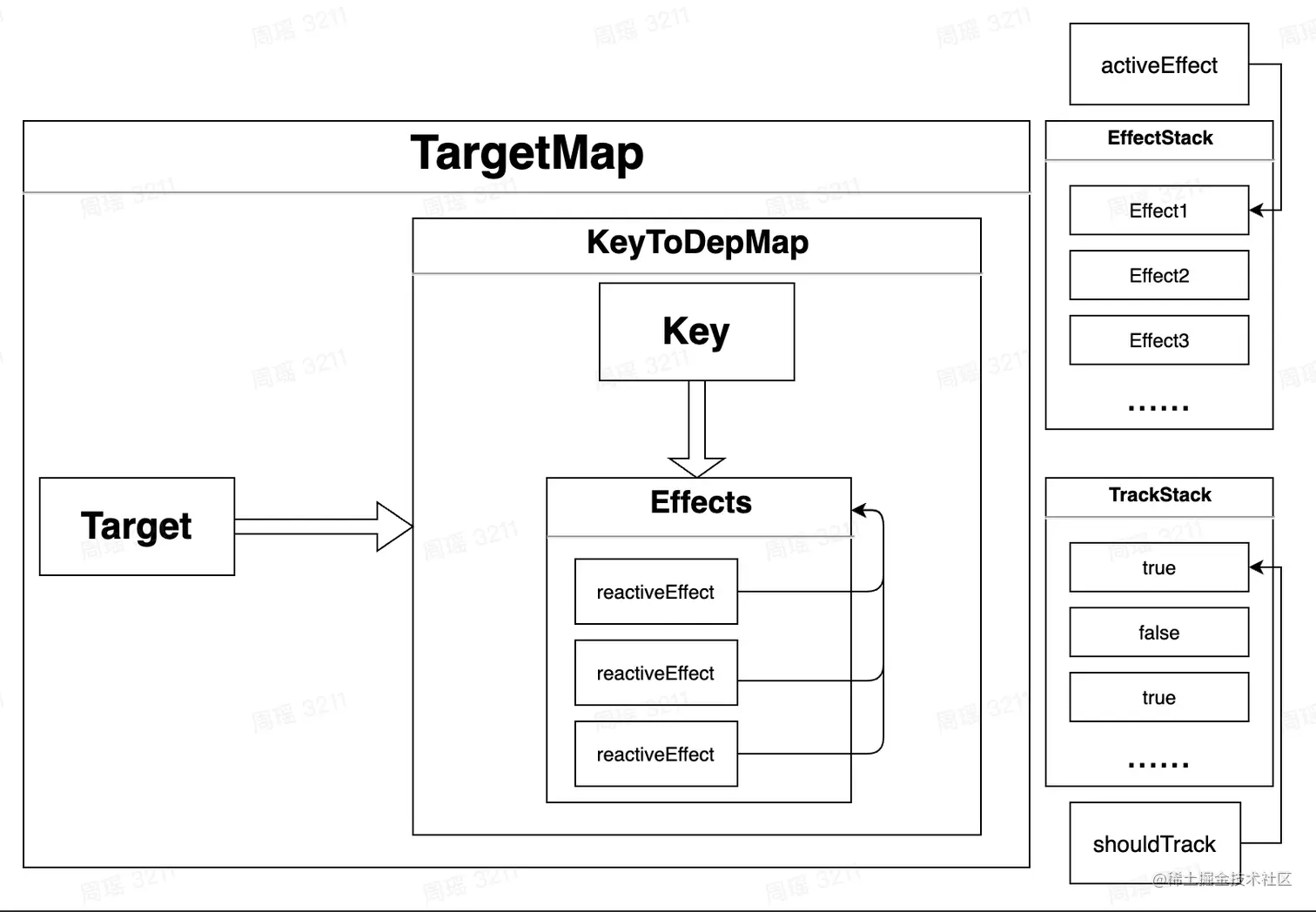 这个模块代码设计的基本思想是发布订阅模式。其内部的数据结构如上图。我们知道了内部reactive、ref、effect的实现,控制依赖收集的机制及解决嵌套的问题都是用了栈的数据结构,通过scheduler选项,可以灵活控制函数执行时机等。