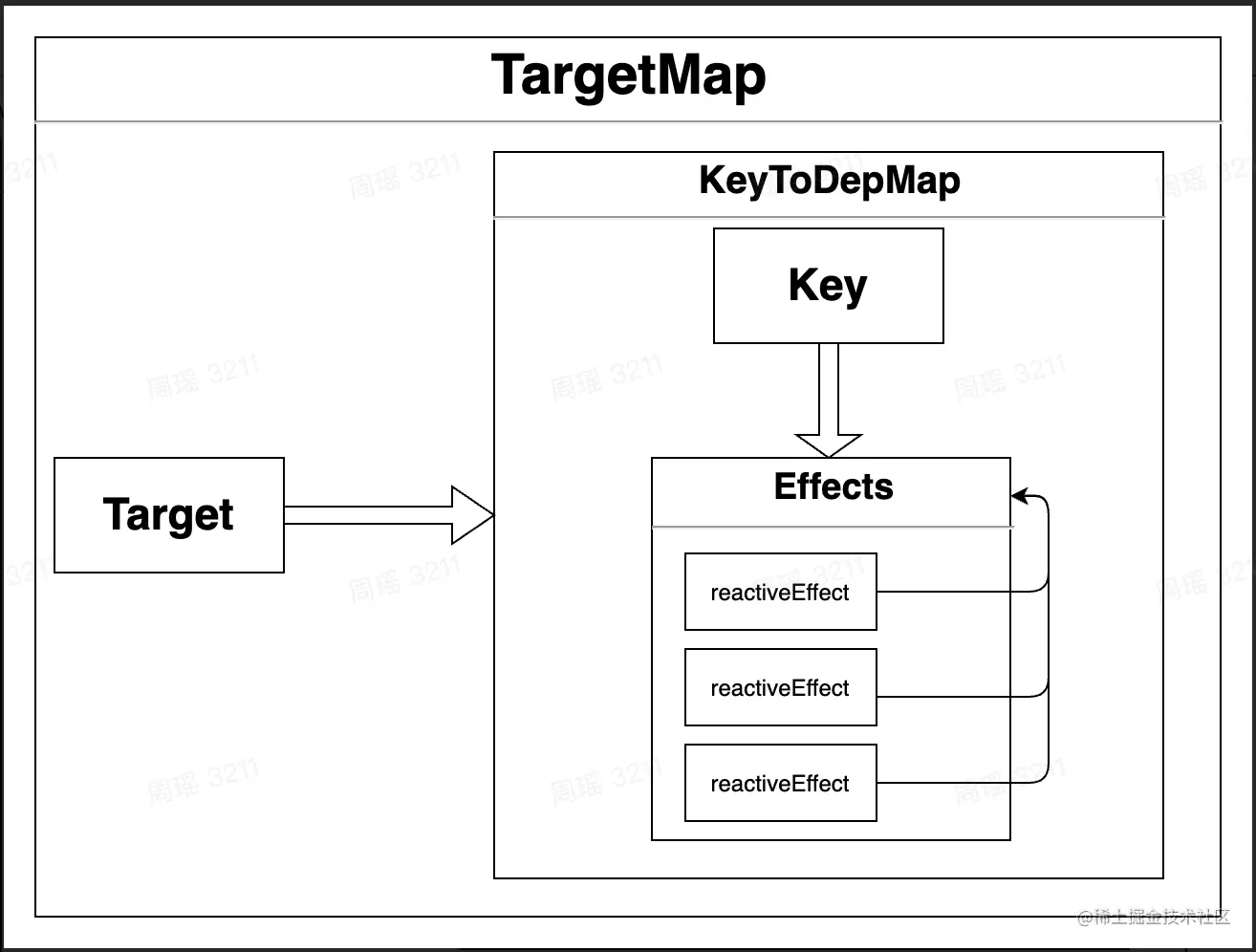 收集依赖,那么需要建立依赖和对应副作用的关系。源码中采用这样的数据结构:target -> key -> dep,target 对应需要收集的对象,key 对应对象的 key,dep 对应副作用函数的集合。TS 的类型定义可能更加直观: