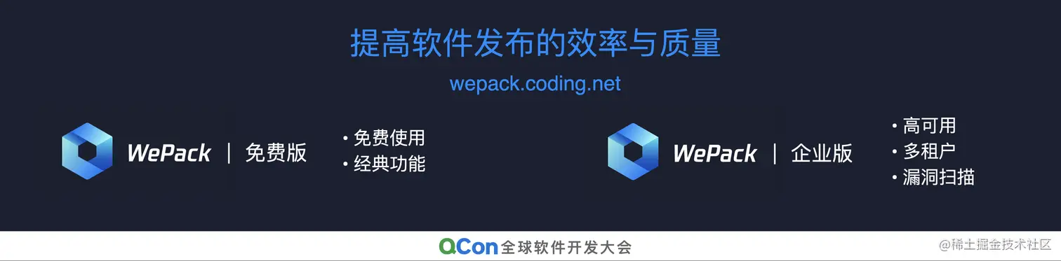 在刚刚开启的 QCon 全球软件开发大会上,CODING 宣布推出全新产品——企业级制品管理平台 WePack。WePack 是 CODING 基于腾讯多年制品质量管理的能力,自主研发的制品管理工具,旨在帮助客户逐步替换落后的工具流程,渐进式地实现 DevOps 转型。