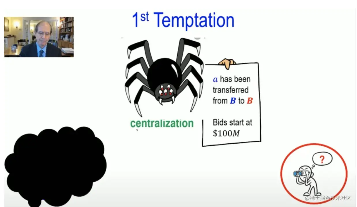 第一个诱惑应该是中心化。简单,但应该被淘汰掉。第二个诱惑:你不信任我没有关系,但是你一定要相信我们五个人。因为如果五个人中有三个人告诉你,蓝色资产现在变成了红色资产,你就应该相信我们了。然后我们用一点小钱担保,以确保真的有奇怪、虚假的事发生时,我们有惩罚。真的吗?很难想象!一个真正运作的去中心化区块链将确保万亿价值,这可是一件大事。所以,当你有这种超大规模的交易时,什么能给你做担保?仅仅靠这五个人少的可怜的零花钱吗?什么都没有!