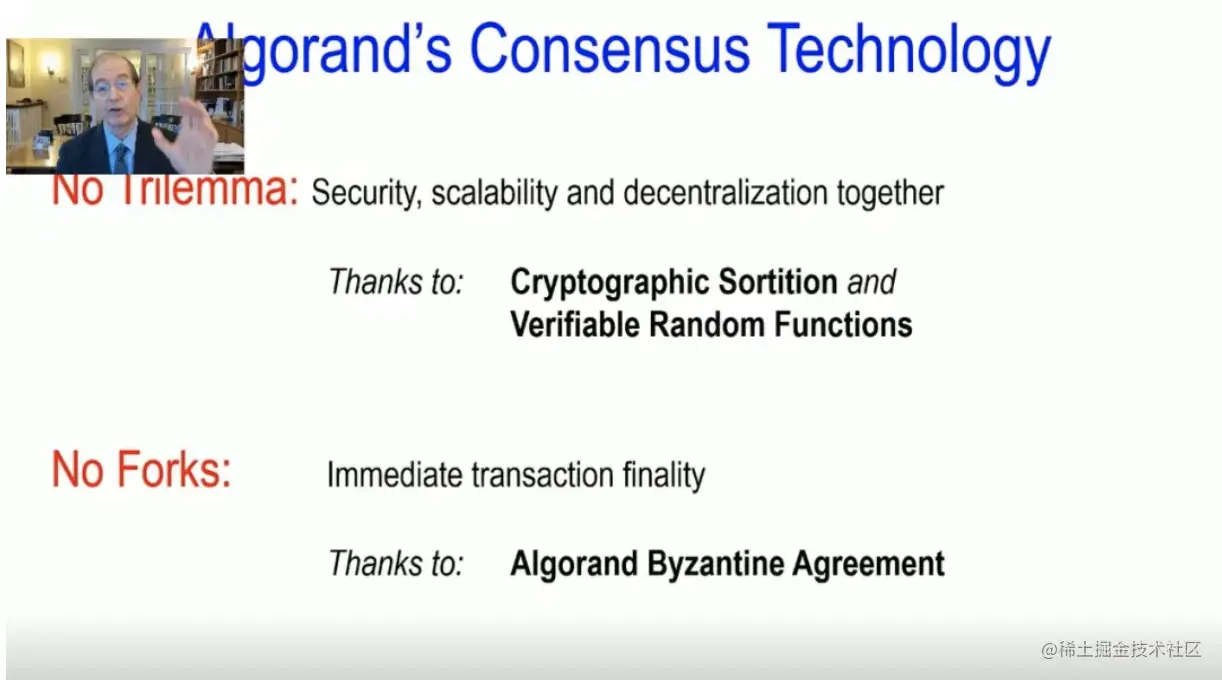 让我们首先回顾一下Algorand的共识技术。首先,**它攻破了区块链“不可能三角”问题,实现了安全性、可扩展性和去中心化的统一。**得益于Algorand的两项关键技术——加密排序和可验证的随机函数,我们的共识没有分叉,它享有即时交易终结性。每一个附加到Algorand链上的区块可以保证是永远留在链上的。因此,你可以信任这些区块的交易,而这要主要归功于Algorand独特的拜占庭协议。