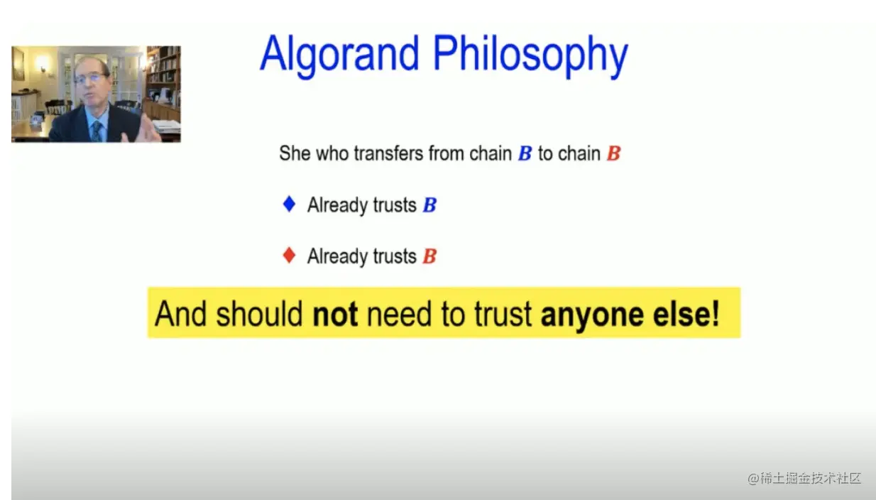 Algorand的理念很简单,将资产从蓝链转移到红链的人,先要信任蓝链。这是肯定的,因为她把资产放在那里。第二,她必须信任红链。这也是肯定的,因为她想把资产转移到红链那里去。所以理念就是,她不应该相信任何人只有链本身,这一理念在Algorand的支持下,一如既往地依靠技术。而这里的技术是紧密链证书,紧密链证书小而简单,容易理解与释意,任何人都能理解。它代表了整个产业链的意志,而不是靠一个两人或五人所说的就够了。该技术将于2021年与大家见面。