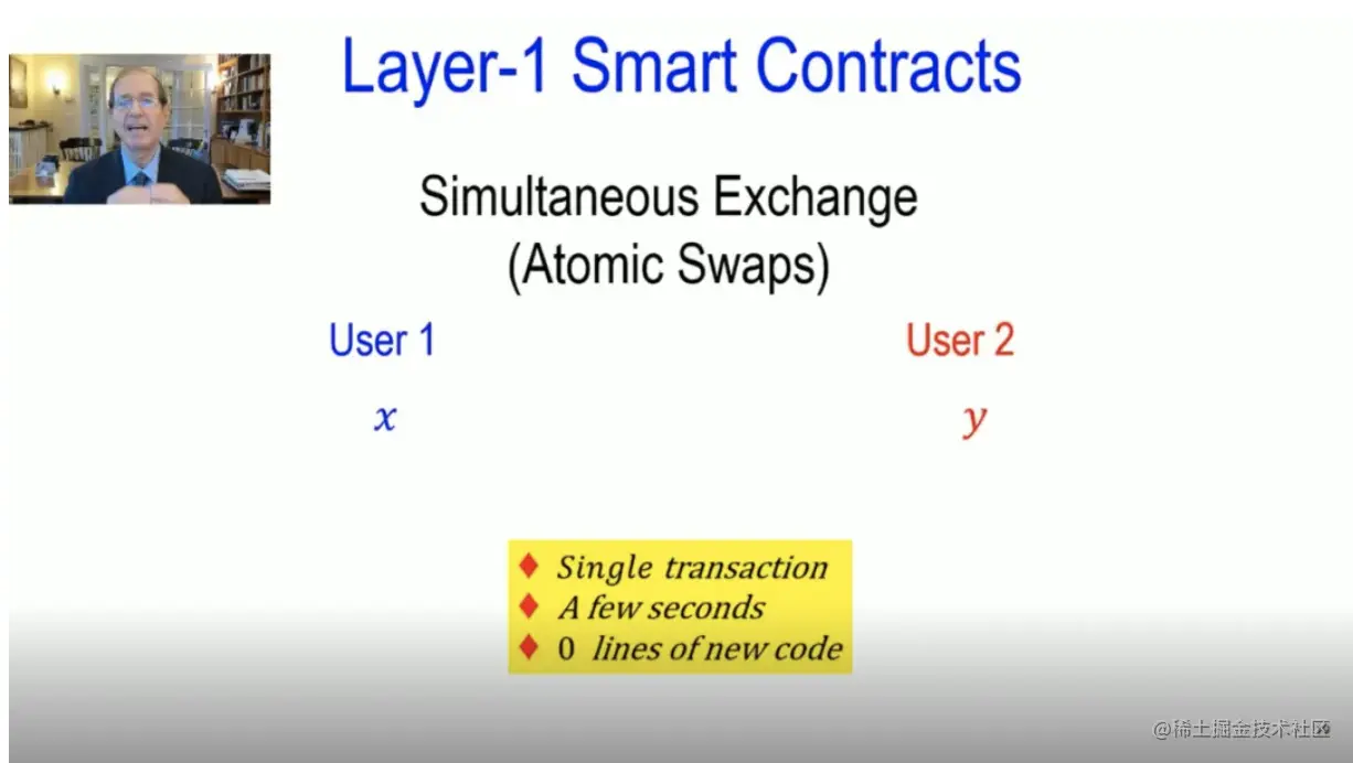 我先说说第一层智能合约。什么是第一层智能合约?首先,它们是智能合约,是在共识基础上执行的,确保安全,但区块生成速度会变慢。**而Algorand第一层智能合约,能保证和普通支付同样的效率和安全。**举个例子,比如:同时交换(原子交换),我有一个你想要的资产 "x",而你有一个我想要的资产 "y",我们该怎么交换资产呢?先交换我的资产吗?答案是否定的。先交换你的财产?答案仍然是否定的。或许找个可信的调解人或中介?不,谢谢!调解员的费用很高,也很难找。如果你在中国,我在美国的话,我们可能不认识彼此都相信的人或第三方机构。然后呢?选择传统的智能合约?我刚才说了,它们速度慢,成本高,很脆弱。因此,还是算了吧!哈希-时间锁怎么样?好吧,先别管它们是什么,它们也很慢的。顺便说一句,它们很容易受到拒绝服务攻击。在Algorand中,我们有其他方式,就像单笔交易基于第一层合约在几秒内进行交易,甚至不需要您编写任何新的代码或软件, "123,交换!",就这么简单。