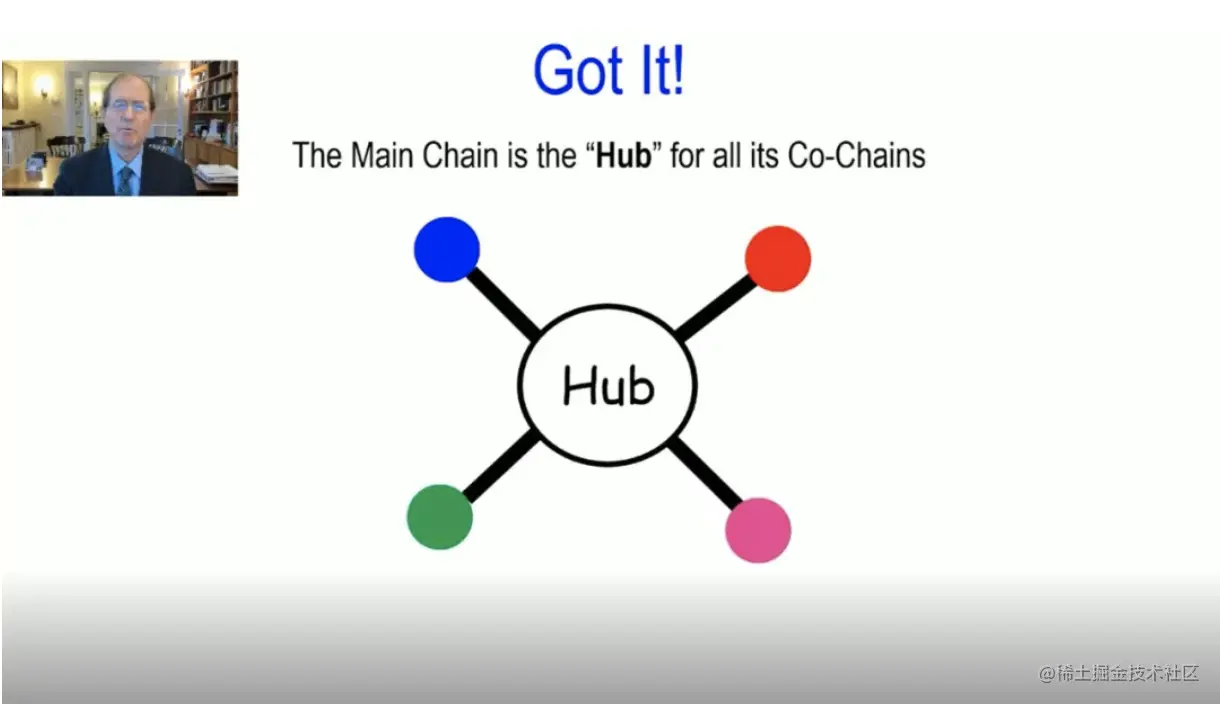 另一个互操作性的例子:蓝链和红链之间,蓝链作为蓝色资产 "a",红链作为红色资产 "b",它们想交换并立即转移到主链上。由于在一次交易中采用了第一层智能合约,它们交换了。然后它们把新的资产运回各自的链上而不存在重复消费。为什么会这样?蓝链不能再换蓝色资产 "a",因为 "a "不再是蓝色的,资产 "a "现在和红链在一起了。主链记录了一切,主链是所有链的枢纽。