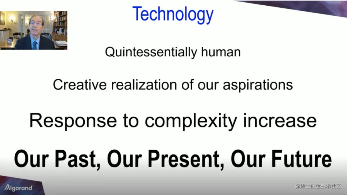 我的看法是,区块链将改善世界的现状,科技将推动人类社会的发展。技术帮我们实现了梦想,也是我们应对复杂世界的方法——法律世界、金融世界,甚至我们的物理世界。我们的生存能力有赖于我们生产更先进的技术的能力。技术是我们的过去,是我们的现在,也将是我们的未来。