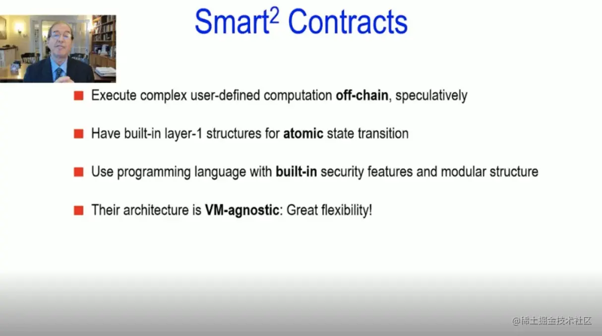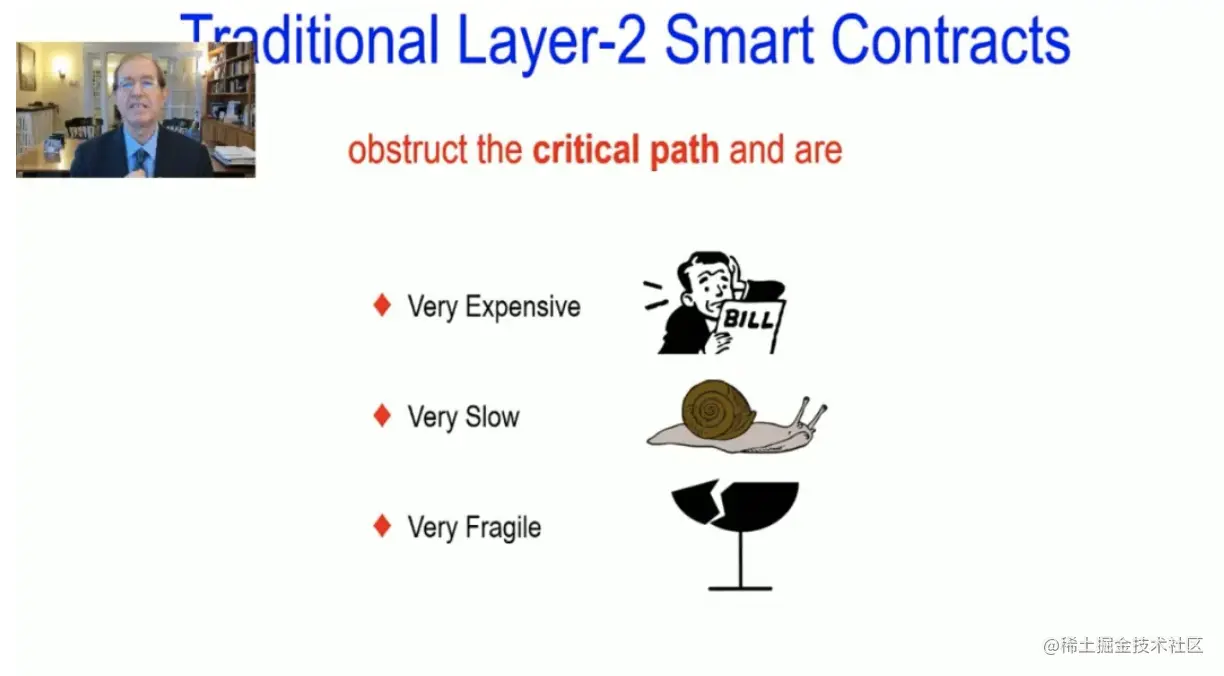 再来说一下Algorand的智能合约。我们必须承认,传统的第一层智能合约,这个“愿景“还没有足够的技术支撑。作为人类,我们应该永远有更高的追求和理想。然后在某个时间点上,我们可以用真正的技术来支持我们的愿景,否则,我们的愿景就归于虚幻了。对于传统的第一层智能合约,其问题是它会阻碍区块链的关键路径,而且它们非常昂贵,速度非常慢,而且非常脆弱。因此,Algorand采取了不同的方式来处理,包括第一层智能合约和智能平方(Smart2)合约。