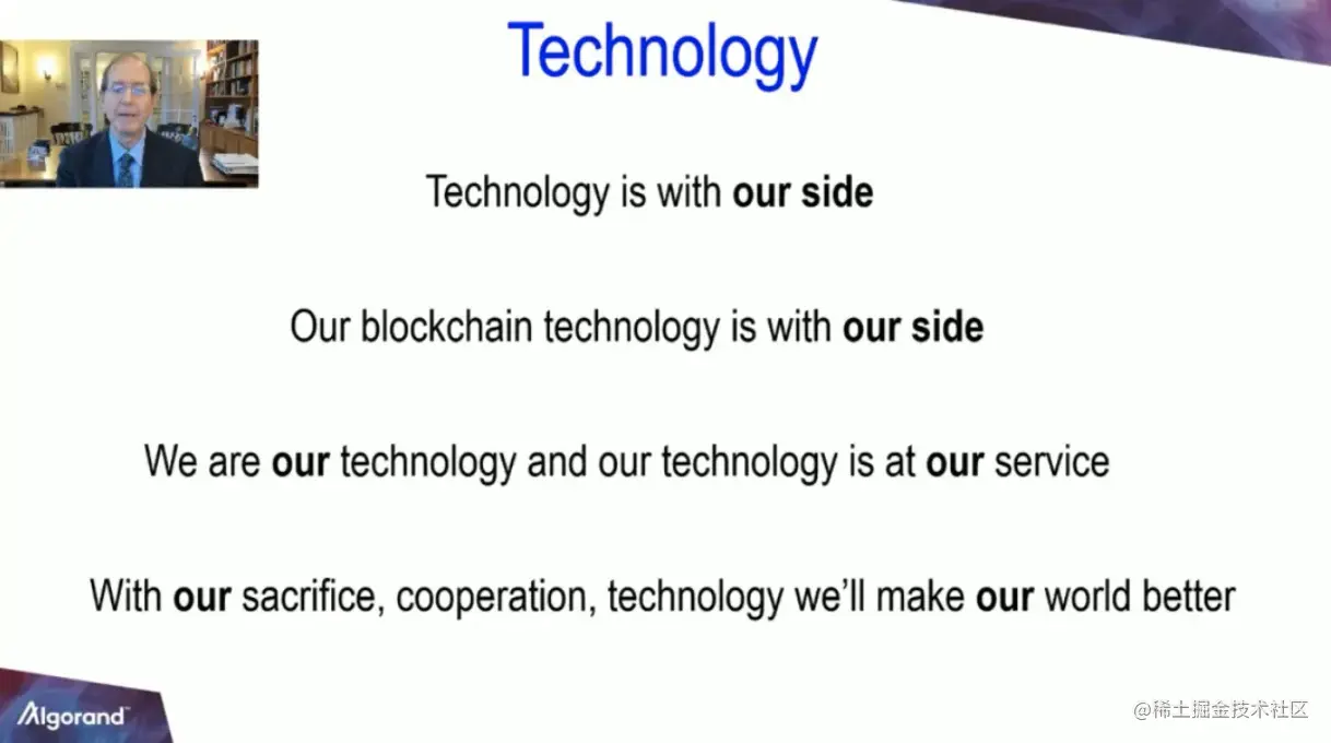 在这里,我想和大家分享一下最新的Algorand区块链技术。但首先,我想让所有被新冠影响的人放心,不论是中国,还是美国,或是意大利,甚至全世界。我想告诉他们:请放心,科技会支持我们,区块链技术就在我们身边支持我们。人是技术之本,技术为人服务。这场疫情让我们懂得,我们的牺牲、合作和技术,将使我们的世界更加美好和公正。