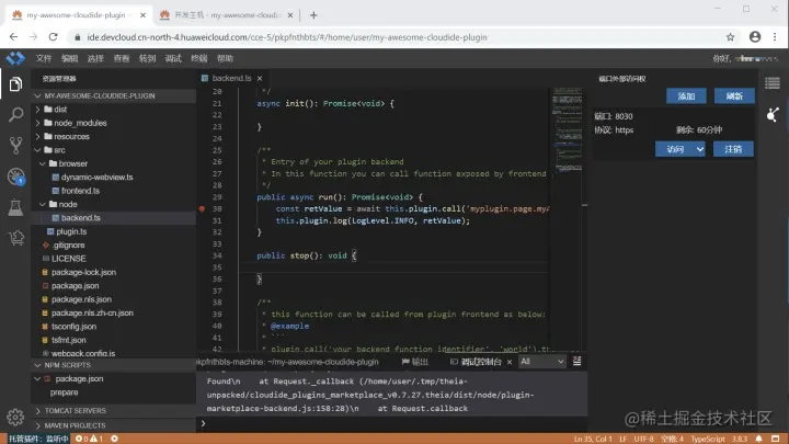 在插件的src/node/目录下存放的是插件的后端代码,后端代码运行在IDE实例的nodejs环境中,插件项目在创建的时候已经默认生成了一个后端文件backend.ts,对于轻量级的插件,只需要在该文件中添加自己想要实现的业务功能即可,该文件包含了三个默认的方法init()、run()、stop()。另外还默认添加了一个doSomething方法,这个方法仅仅是作为示例使用,开发者可以根据需要进行修改或删除。这里我们简单介绍下init, run和stop方法,详细的解析可以参考插件开发指南。