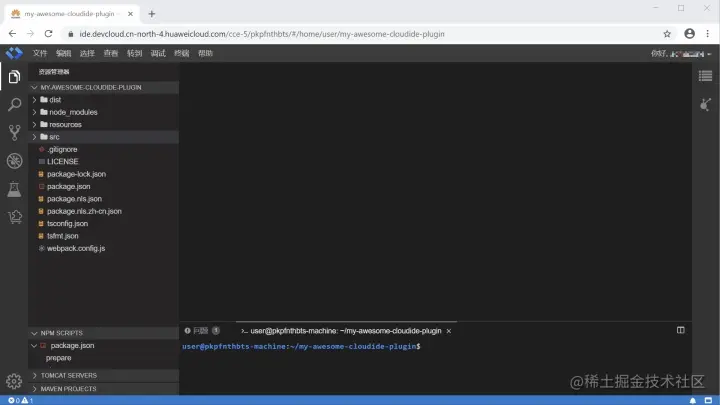 点击访问就可以访问我们刚刚启动的调试实例,在弹出的调试实例中我们等待插件被加载,然后切换回我们的CloudIDE开发实例。