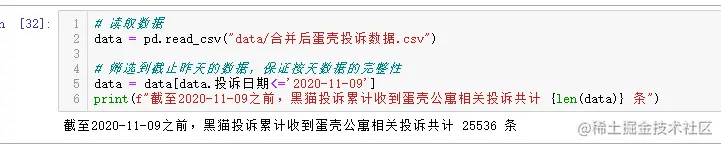 print(f"截至2020-11-09之前,黑猫投诉累计收到蛋壳公寓相关投诉共计 {len(data)} 条")
