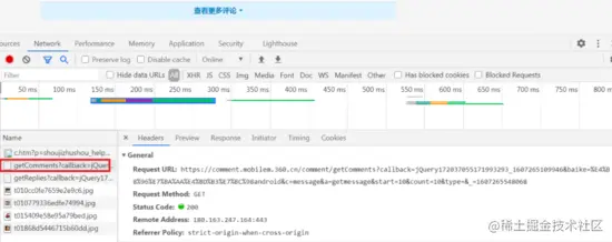 此时打开开发者工具并选择 Network 项,点击 查看更多评论 ,然后可以看到 getComments 请求,如图所示: