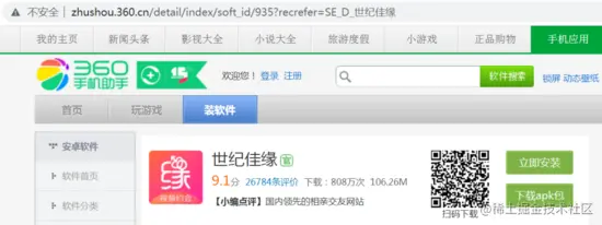 本文以 360 手机助手为例,地址为: zhushou.360.cn/ ,相亲软件选择 3 个比较流行的,分别为:世纪佳缘、百合婚恋、有缘网,我们使用 Python 爬取软件评论区,看看用户评价情况。