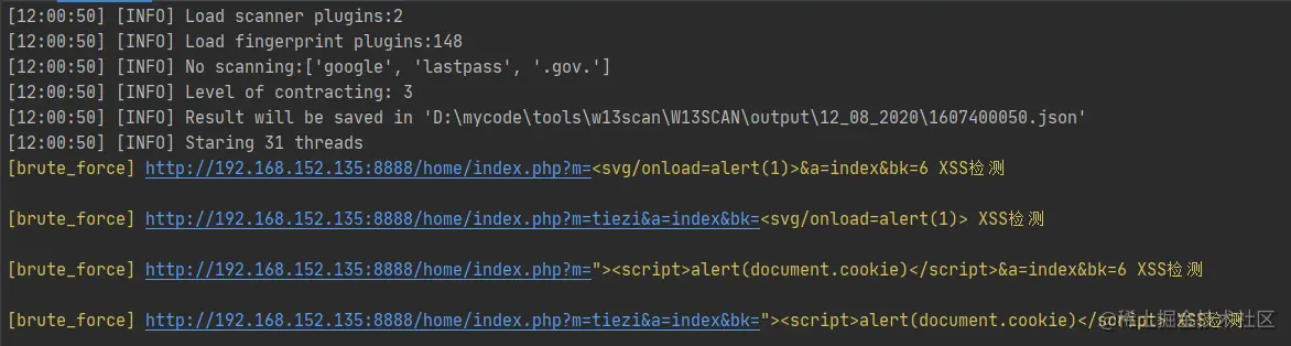 在上图中可以看到我们的插件已经成功运行,并检测到了XSS漏洞