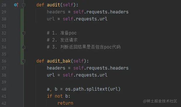 在上图中,我新建了一个audit方法,并接收了请求头信息和要请求的URL地址,并给出了要实现XSS漏洞检测的三个步骤: