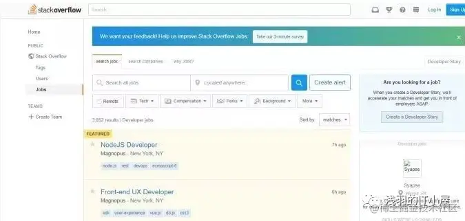 被广大程序员熟知的 Stackoverflow 本身就是一个全民远程工作的公司,程序员在远程工作中有很大的先天优势,Stackoverflow Jobs 里有远程职位的筛选,这里有丰富的远程技术职位。