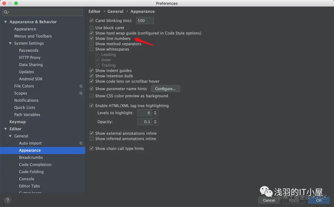 在File -> Settings ->Editor ->General -> Appearance 里选择Show line numbers