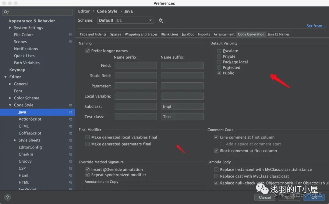 1.File -> Settings ->Editor ->Code Style里选择Java->Code Gendration