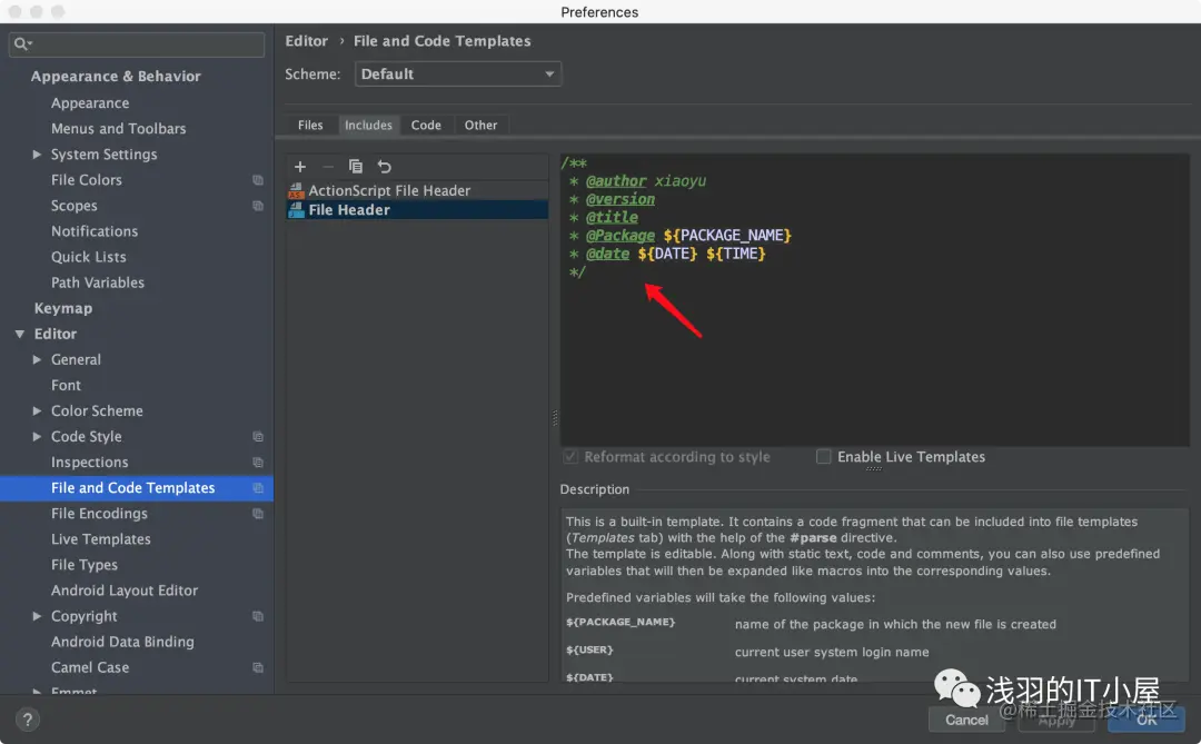 File -> Settings -> Editor -> File and Code Templates里设置