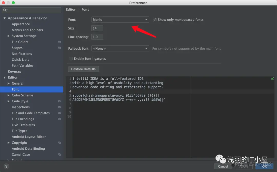 打开intellij ->File ->Settings->搜索Font