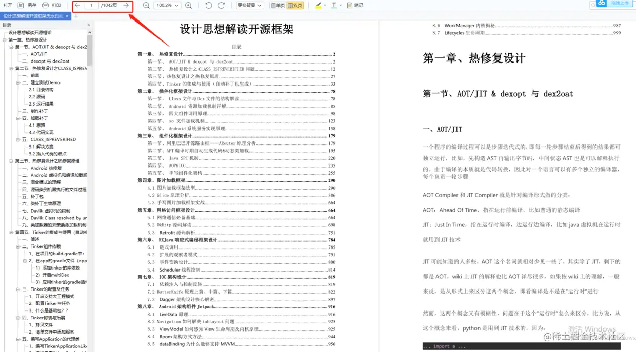 我花了将近半个月时间将Android热修复框架、插件化框架、组件化框架、图片加载框架、网络访问框架、RxJava响应式编程框架、IOC依赖注入框架、最近架构组件Jetpack等等Android第三方开源框架整合成了一套系统知识笔记PDF,长达1042页!相信看完这份文档,你将会对这些Android第三方框架有着更深入、更系统的理解。