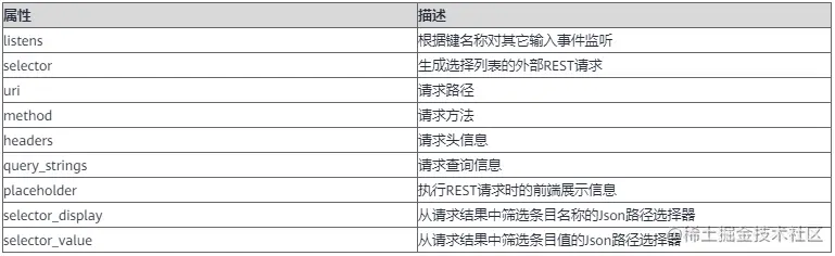 运行时使用外部REST API的请求结果作为选择列表。 附加属性如下表所示。