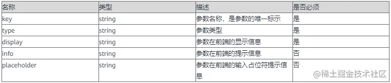 { "type":"sample_component", "categories":["sample"], "display":"sample component", "description":"Input types illustration sample component", "iconURL":"", "inputs":[ { "key":"parameter01", "display":"parameter 1", "type":"text", "placeholder":"A input hint message here.", "default":"default_value", "required":true }, { "key":"parameter02", "display":"parameter 2", "type":"text", "placeholder":"A input hint message here.", "default":"default_value", "required":true } ] }