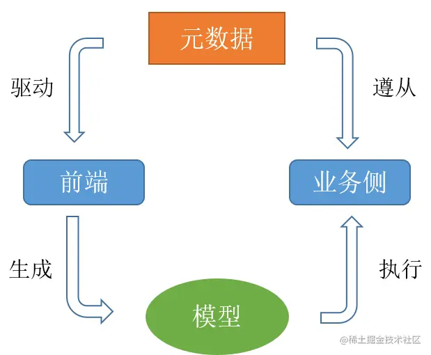 需要注意的是,元数据并不是以前端开发为中心,它主要是为模型的生成器和模型消费者提供一致的通用建模。在业务流中,前端框架只是严格按照建模的概念生成业务数据模型。但是业务侧不应受到前端的限制,应当适用于任何可以符合元数据正确生成数据模型的前端框架。