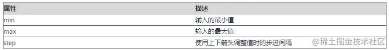 具有范围和步长支持的数字输入字段。 附加属性包括“min”、“max”和“step”。