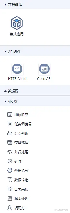 组件是业务流任务中的基本单元,每个组件都有特定的功能,如“Open API”组件用于定义和开放一个API、“数据源”类型组件用于选择数据源用于数据迁移或者数据开放、“脚本处理”组件用于使用脚本处理数据等,用户通过配置和连接各种类型的组件进行业务编排。下图是当前业务流提供的组件。