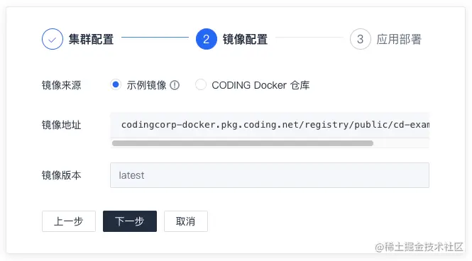 勾选使用官方提供的示例镜像或 CODING Docker 仓库。