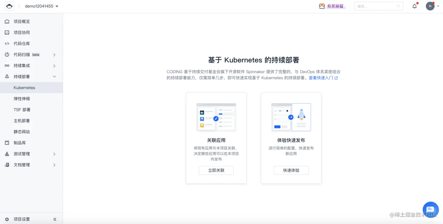 在 CODING 中创建一个新项目,进入到【持续部署】-【Kubernetes】页面,点击「体验快速发布」入口。通过体验快速发布,您将会了解 CODING 持续部署如何发布一个 Kubernetes 应用,适用于新手使用者对持续部署能力的探索,仅需三步勾选和确认,即可完成一个应用的发布。